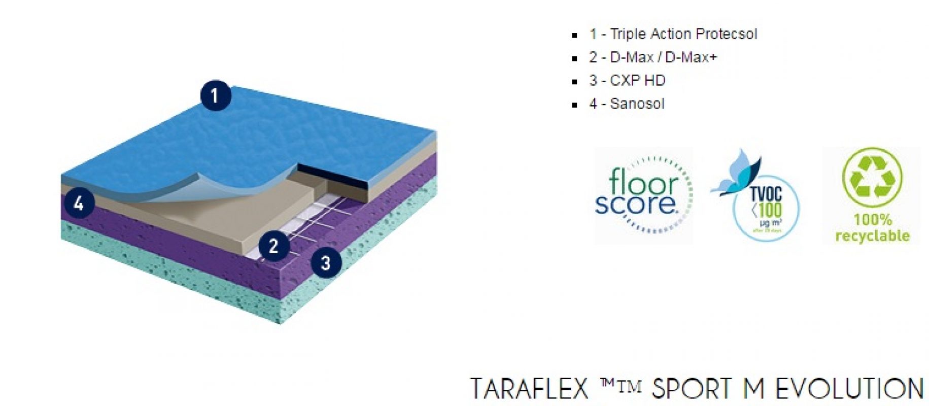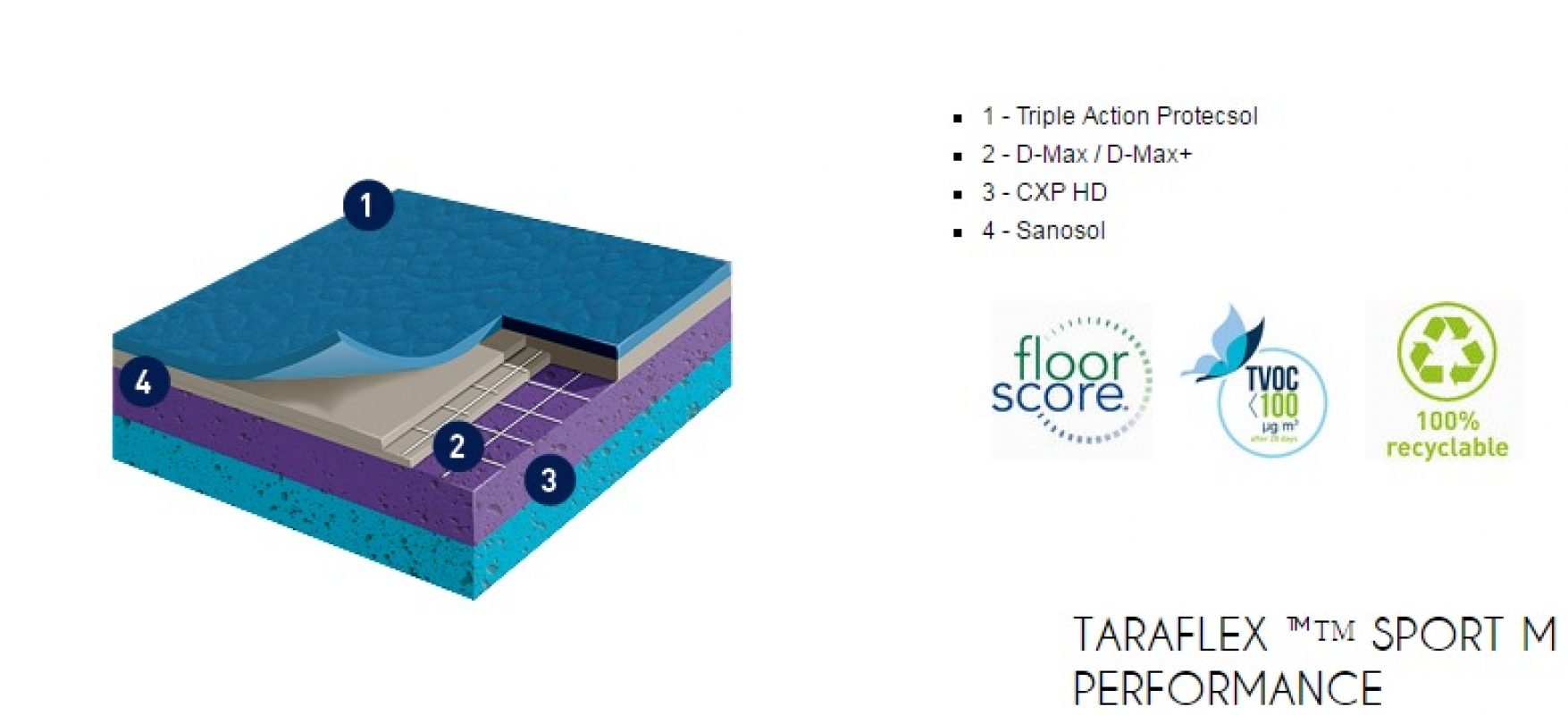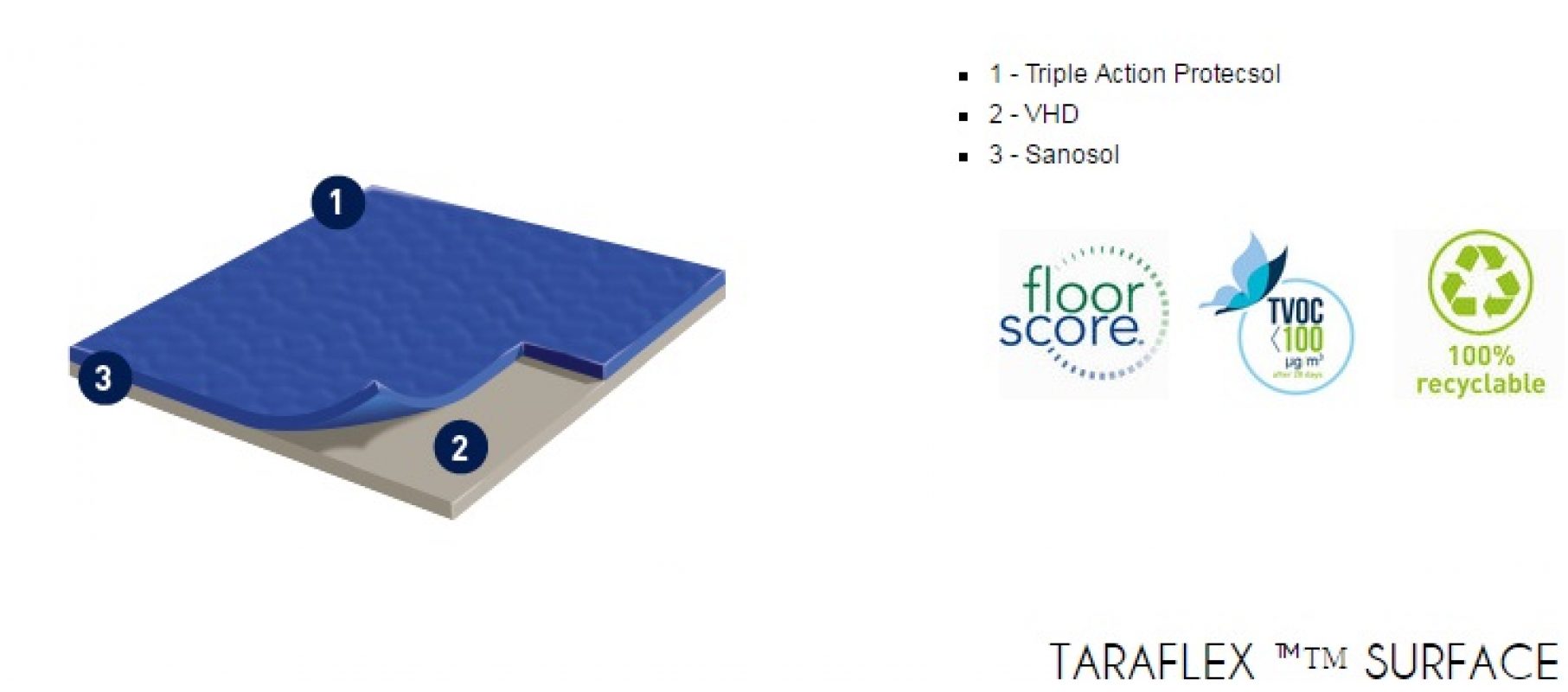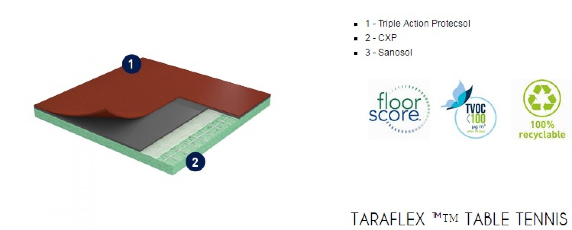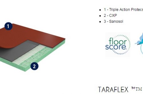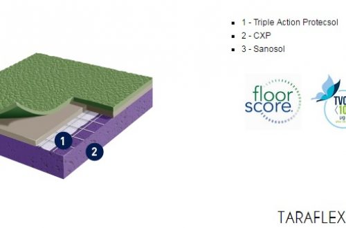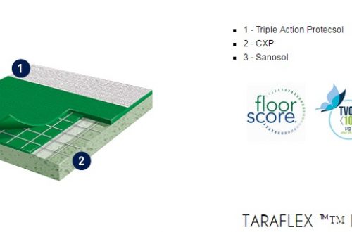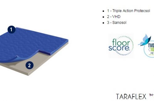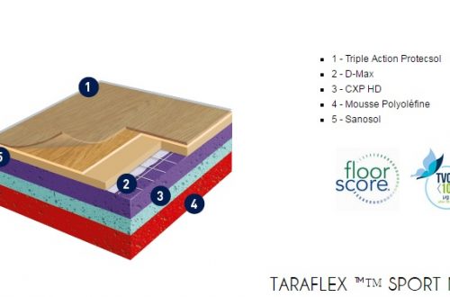 Gerflor TARAFLEX (w potocznym nazewnictwie TERAFLEX) to syntetyczna wielowarstwowa nawierzchnia sportowa, której wierzchnia warstwa o strukturze „skórki pomarańczy” (gr. 2,1mm) wykonana jest z czystego winylu, środek wzmocniony siatką z włókna szklanego, a warstwa spodnia (sprężysta) z pianki PVC. Powierzchnia wykładziny zabezpieczona jest specjalnym środkiem PROTECSOL, który tworzy usieciowaną strukturę zabezpieczającą przed zabrudzeniami, zmniejsza koszty konserwacji oraz łagodzi skutki niszczenia. Cała wykładzina impregnowana jest środkiem SANOSOL, stanowiącym zabezpieczenie przeciw-pleśniowe i bakterio-statyczne.