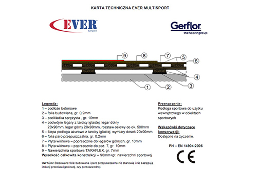 EVERSPORT posiada autorską konstrukcję drewnianą podwójnie legarowaną na podkładkach elastycznych, zgodną ze wszystkimi parametrami normy EN-PN 14904 i posiadającą certyfikat CE. Sprawdzona i stosowana od wielu lat, w zależności od potrzeb użytkowników oferujemy systemową podłogę EVERSPORT z wykładzinami sportowymi o grubości od 3 mm do 9 mm.